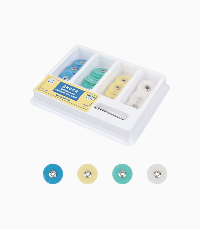 Assortiment de disques abrasifs dentaires pour le polissage précis des restaurations. Disponibles en 12 mm et 14 mm, avec 4 degrés d’abrasion identifiables par couleur. Boîte de 40 ou 80 unités + mandrin inclus.