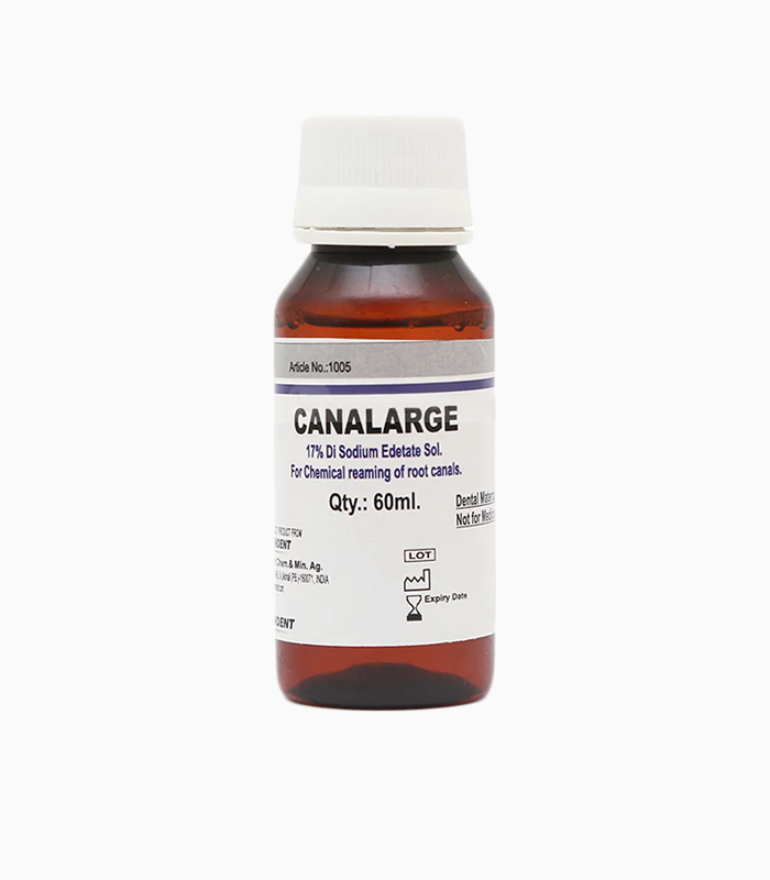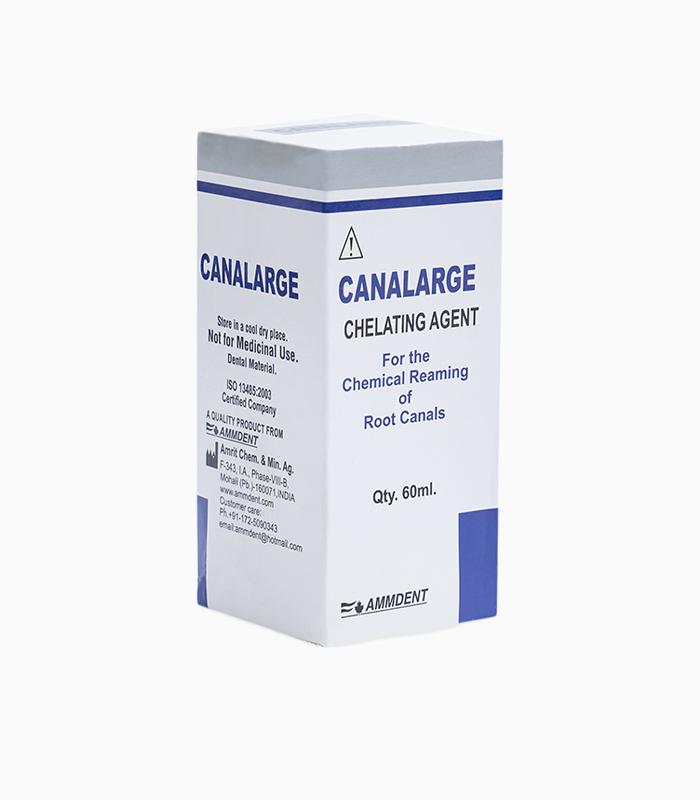 Ammdent Canalarge est une solution EDTA neutre, agissant comme un puissant agent chélatant, facilitant le nettoyage des canaux radiculaires grâce à sa faible tension de surface.